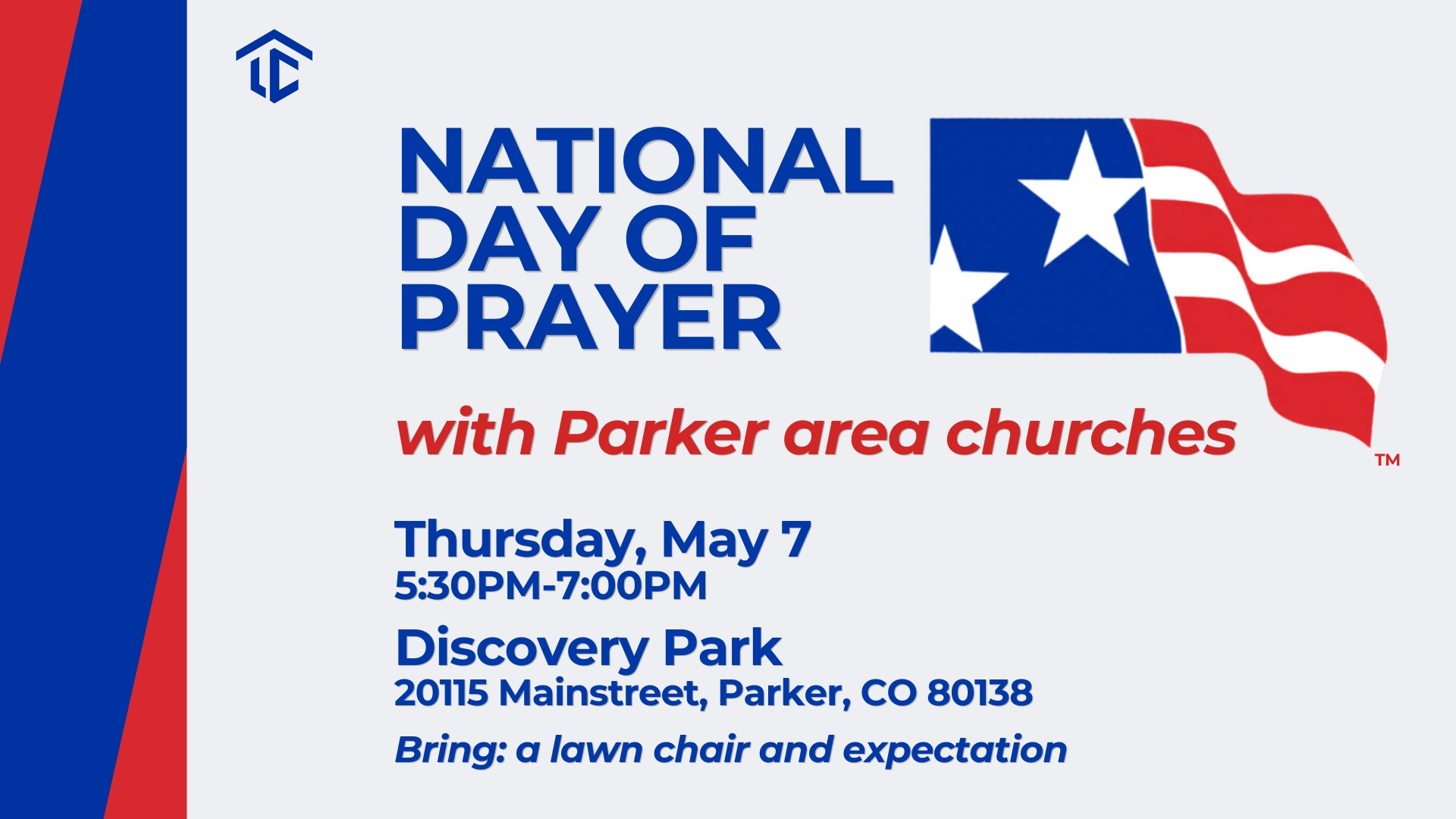 Join Lighthouse Church as we gather with churches across the Parker area for the National Day of Prayer, a powerful time of unity, faith, and seeking God together. This special community event will take place on Thursday, May 7 from 5:30 PM to 7:00 PM at Discovery Park in Parker. As we come together in prayer for our city, our nation, and one another, we believe God will move in meaningful ways. Bring a lawn chair, invite a friend, and come with expectation as we stand united in faith and lift our voices in prayer.